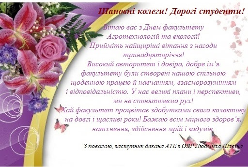 У цей урочистий день о 15:00 годині відбулось засідання факультету агротехнологій та екології на платформі ZOOM під час якої з привітальним словом звернувся ректор нашого навчального закладу доктор технічних наук, професор, член –кореспондент НААН України Володимир Кюрчев. Він подякував колективу за сумлінну працю, розвиток освіти і науки, побажав подальшого розквіту та творчих успіхів на освітянській та науковій ниві. Також  привітання та добрі побажання пролунали від першого декана, а нині проректора з навчально-педагогічної роботи, кандидата технічних наук, доцента Олександра Ломейка.