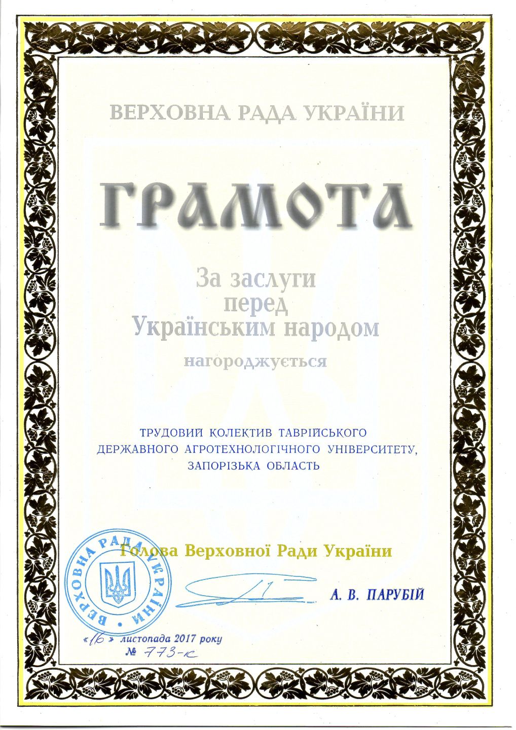 ТДАТУ НАГОРОДЖЕНО ГРАМОТОЮ ВЕРХОВНОЇ РАДИ УКРАЇНИ «ЗА ЗАСЛУГИ ПЕРЕД УКРАЇНСЬКИМ НАРОДОМ»