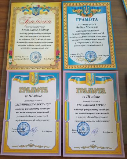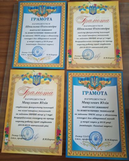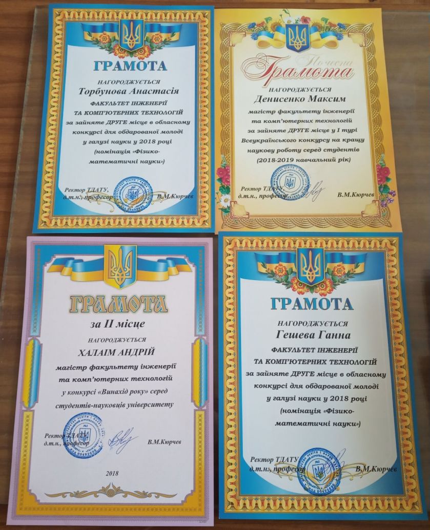 На факультеті «Інженерії та комп’ютерних технологій» відбулося нагородження студентів за наукову діяльність. Декан факультету Вершков Олександр Олександрович урочисто вручив грамоти та подяки Гешевій Ганні за зайняте ІІ місце в обласному конкурсі для обдарованої молоді у номінації «Фізико-математичні науки», Денисенку Максиму за зайняте ІI місце в І турі Всеукраїнського конкурсу на кращу наукову роботу серед студентів, Лебедю Михайлу за зайняте ІІ місце в обласному конкурсі для обдарованої молоді у номінації «Технічні науки», Мацулевич Юлії за зайняте I місце в І турі Всеукраїнського конкурсу на кращу наукову роботу серед студентів та за ІІІ місце в обласному конкурсі для обдарованої молоді у номінації «Технічні науки», Світличному Олександру за зайняте ІІІ місце у конкурсі «Винахід року» серед студентів – науковців університету, Торбуновій Анастасії за зайняте ІІ місце в обласному конкурсі для обдарованої молоді у номінації «Фізико-математичні науки», Угольнікову Віктору за зайняте III місце в І турі Всеукраїнського конкурсу на кращу наукову роботу серед студентів та за ІІІ місце у конкурсі «Винахід року» серед студентів – науковців університету, Халаїму Андрію за зайняте ІІ місце у конкурсі «Винахід року» серед студентів – науковців університету, Шпильовій Олександрі за зайняте I місце в І турі Всеукраїнського конкурсу на кращу наукову роботу серед студентів та за ІІІ місце в обласному конкурсі для обдарованої молоді у номінації «Технічні науки».