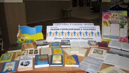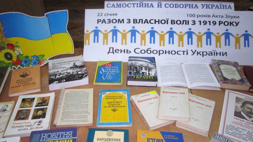 До Дня Соборності України та до 100-РІЧЧЯ ПРОГОЛОШЕННЯ АКТА ЗЛУКИ наукова бібліотека підготувала експрес-виставку «Самостійна й соборна Україна», яка демонструється в читальному залі. На виставці представлено видання з новітньої історії України, які надають можливість детально ознайомитись з історичними фактами та передісторією виникнення свята. Це зокрема – Л. І. Кормич «Історія України: від найдавніших часів і до ХХІ століття. Т. Олесіюк «Соборна Україна», «Народження країни. Від краю до держави», В. Винниченко «Відродження нації», М. Грушевський «На порозі Нової України», С. Геник «Тернистий шлях до волі» та ін.