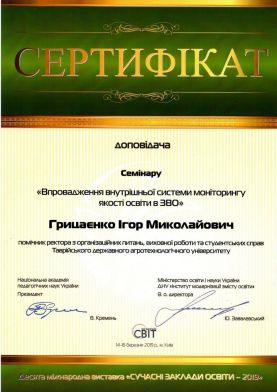 Завдяки такій ефективній системі внутрішнього забезпечення якості вищої освіти освітній процес у Таврійському державному агротехнологічному університеті з 2009 року сертифікований у відповідності до міжнародного стандарту системи якості ISO 9001:2009 та Національного стандарту України ДСТУ ISO 9001:2009.