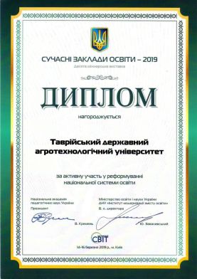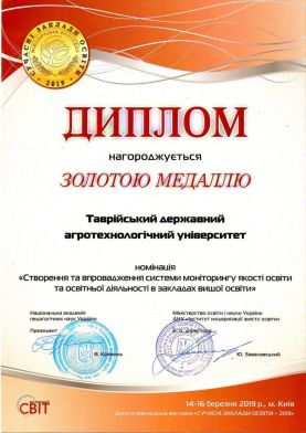 Таврійський державний агротехнологічний університет також взяв активну участь у роботі виставки. Крім головної нагороди Гран-Прі, якою університет був нагороджений за високий рівень післядипломної освіти, особливу відзнаку на виставці наш навчальний заклад отримав за одну з найкращих внутрішніх систем забезпечення якості вищої освіти. Конкурсна робота ТДАТУ в номінації «СТВОРЕННЯ ТА ВПРОВАДЖЕННЯ СИСТЕМИ МОНІТОРИНГУ ЯКОСТІ ОСВІТИ ТА ОСВІТНЬОЇ ДІЯЛЬНОСТІ В ЗАКЛАДАХ ВИЩОЇ ОСВІТИ» (автори: Кюрчев В.М. – д.т.н., професор, ректор ТДАТУ; Ломейко О.П. – к.т.н., доцент, проректор з науково-педагогічної роботи; Грицаєнко І.М. – помічник ректора з виховної роботи; Болтянська Н.І. – к.т.н., доцент, начальник Науково-методичного центру; Скляр Р.В. – к.т.н., доцент, завідувач відділу моніторингу якості освіти; Шульга О.А. – методист Науково-методичного центру) була оцінена конкурсною комісією найвищою нагородою – «ЗОЛОТОЮ МЕДАЛЛЮ»!