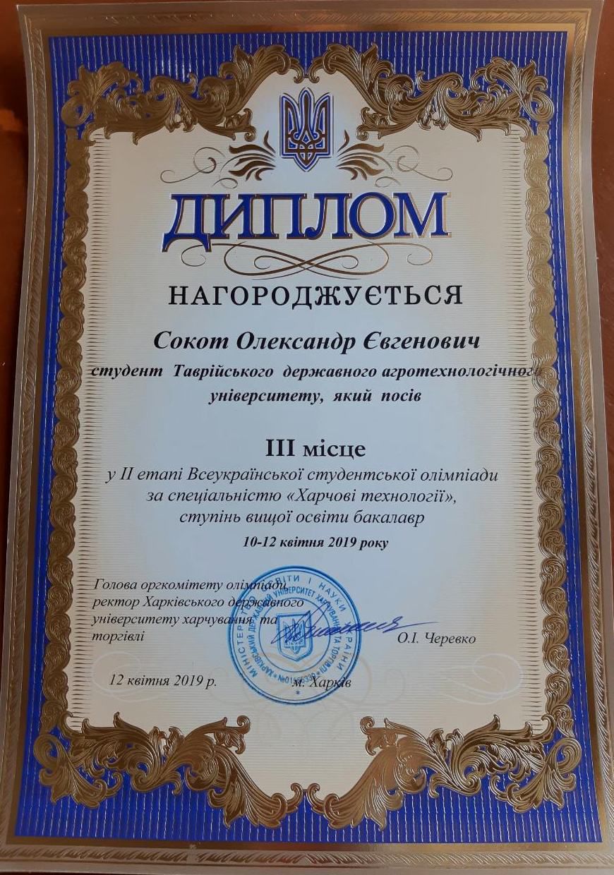Перемога у ІІ етапі Всеукраїнської студентської олімпіади зі спеціальності 181 «Харчові технології»