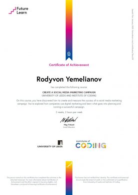 Родивон Ємельянов, студент 31 МН групи (науковий керівник Кривонос І.А.), отримав ґрунтовні знання головних стратегій цифрового маркетингу та особливостей планування успішної маркетингової кампанії, обравши двотижневий курс «Create a social media marketing campaign» від University of Leeds та Institute of Coding.