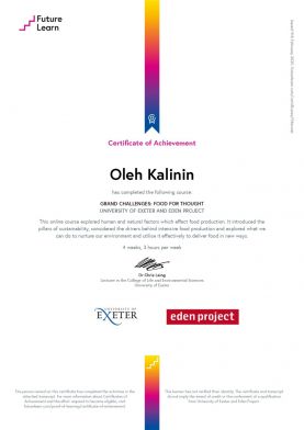 Студент 41 АГ групи Олег Калінін (науковий керівник Лемещенко-Лагода В.В.) обрав навчальний курс «Grand challenges: food for thought» від University of Exeter та Eden Project, зосередивши свою увагу на проблемі збереження земельних угідь в умовах інтенсивного ведення сільського господарства.