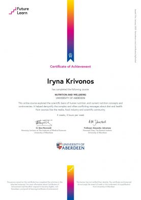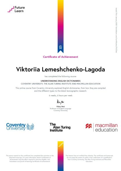 Підвищити рівень своєї педагогічної майстерності вирішили й наукові керівники студентів, викладачі кафедри «Іноземні мови» Кривонос І.А. та Лемещенко-Лагода В.В., які успішно завершили курси «Nutrition and wellbeing» від University of Aberdeen та «Understanding English dictionaries» від Coventry University, The Alan Turing Institute та Macmillan Education.