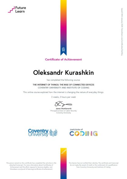 На сьогоднішній день платформа FutureLearn пропонує широкий спектр освітніх курсів різноманітної тематики. Зокрема, студент 31АІ групи Олександр Курашкін  (науковий керівник Лемещенко-Лагода В.В.) успішно завершив двотижневий курс «The Internet of Things: the rise of connected devices» від Coventry University та Institute of Coding, що присвячений перспективам розвитку та використання технології Інтернету Речей у сучасному світі.