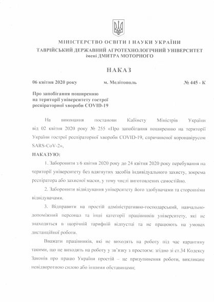 1. Заборонити з 6 квітня 2020 року до 24 квітня 2020 року перебування на території університету без вдягнутих засобів індивідуального захисту, зокрема респіратора або захисної маски, у тому числі виготовлених самостійно.