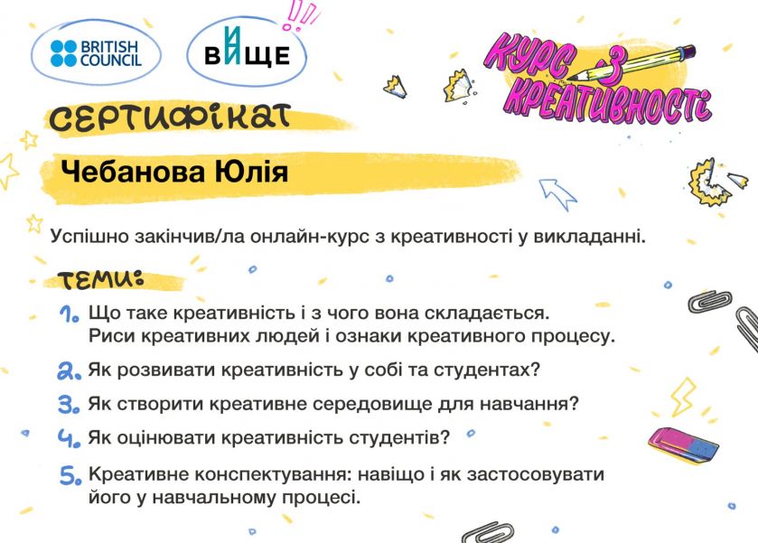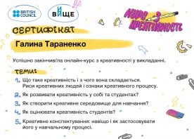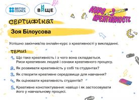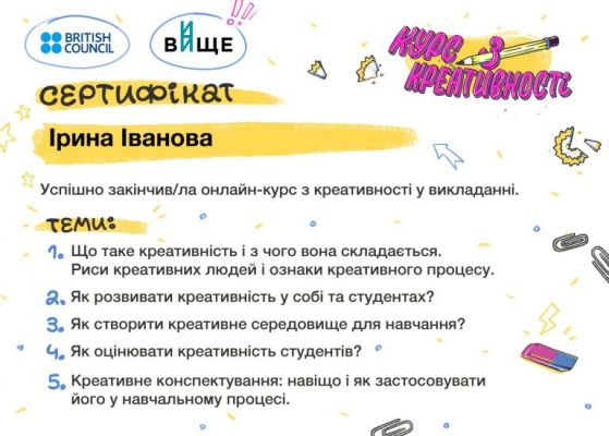 Наприкінці курсу після проходження тесту усі слухачі отримали сертифікати. Лише креативне викладання в тандемі з креативним викладачем може виховати та розвити творчі здібності студентів, ті якості які так необхідні випускнику закладу вищої освіти.