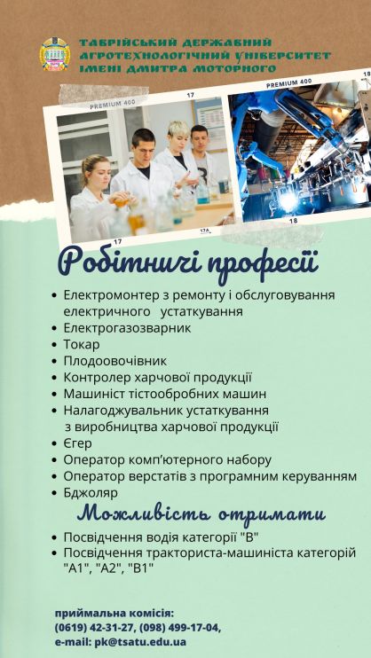 20 перспективних спеціальностей пропонує вступникам лідер вищої аграрної освіти України – Таврійський державний агротехнологічний університет імені Дмитра Моторного. До тих спеціальностей, яким багато років навчають у ТДАТУ, нещодавно додалися й нові: «Туризм», «Готельно-ресторанна справа» та «Прикладна механіка» за освітньо-професійною програмою «Комп’ютерне проектування і дизайн».