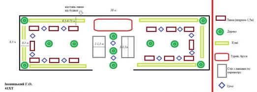 In general, many interesting ideas were expressed in the presented projects. Students offered to set up benches, tables, arbours and even swings, and for sporting activities to place on a bar or tennis table. Next to the tables, a trash bin should be installed to keep the environment clean. The area can be landscaped with trees including conifers, lawn grass and flowers. Competitors offer to lay paths of sidewalk tiles on the territory of the site.