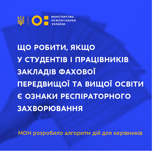 МОН рекомендує алгоритм дій для керівників закладів фахової передвищої та вищої освіти у разі виявлення у здобувачів, викладачів або працівників ознак гострого респіраторного захворювання. Відповідний лист оприлюднено на сайті МОН.