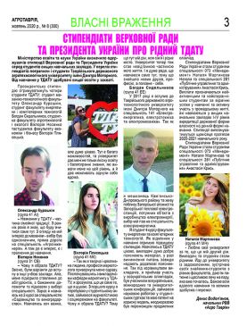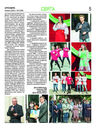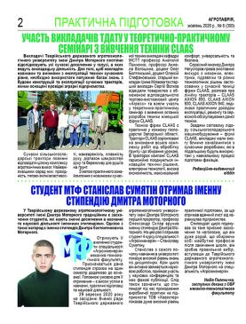 Переглянувши номер, можна дізнатися: про участь викладачів ТДАТУ у теоретично-практичному семінарі з вивчення техніки CLAAS, хто став володарем іменної стипендії Дмитра Моторного, президента та Верховної ради України.