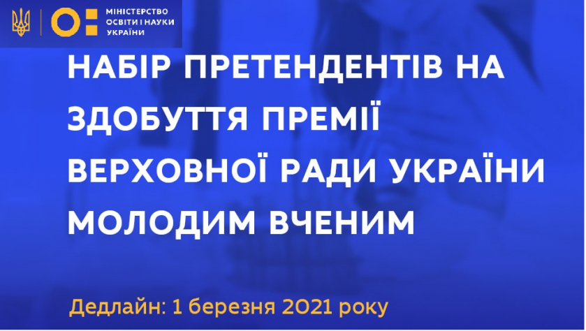 Міністерство освіти і науки України проводить набір претендентів на здобуття Премії Верховної Ради України молодим вченим. Прийом документів триватиме до 01 березня 2021 року.
