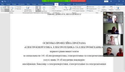 Чергове засідання робочої групи відбулось 14.04.2021 року онлайн на платформі Zoom. Протягом двох годин члени робочої групи розглядали пропозиції, які були внесені до освітньо-професійної програми. На засіданні обговорювались зміни, які запропоновано внести у обов’язкові освітні компоненти освітньо-професійної програми, а саме: уведення дисциплін «Основи демократії», «Екологія за професійним спрямуванням», «Історія науки і електротехніки з основами інтелектуальної власності», «Фізичне виховання», «Апарати керування і захисту», «Електрична частина станцій і підстанцій», «Електронні пристрої в системах керування», «Поновлювальні джерела енергії та енергозбереження», розширення деяких дисциплін, інші зміни.
