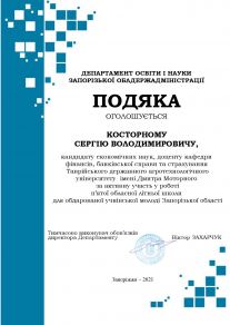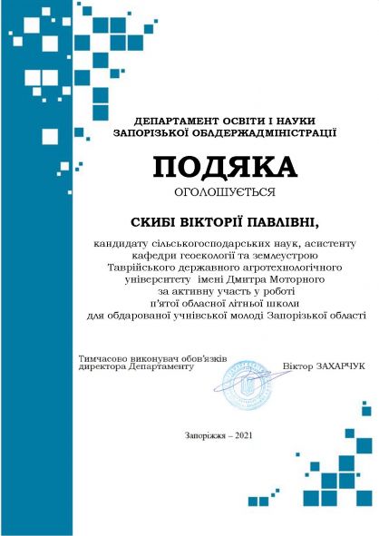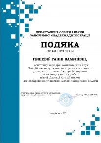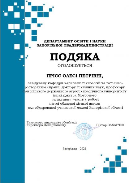 Крім того, для учнівської молоді Запорізької області, науковці ТДАТУ підготували та дистанційно провели 12 науково-популярних лекцій, присвячених результатам, проблемам та перспективам наукових досліджень: математиці (ас. Лариса Халанчук), історії (к.і.н. Володимир Михайов), економіці (д.е.н. Сергій Кальченко, к.е.н. Сергій Косторной), ІТ-технологіях (ас. Ганна Гешева), харчових технологіях (д.т.н. Олеся Прісс, к.т.н., Віра Тарасенко, ас. Олена Федосова), нанотехнологіях (к.т.н. Альона Дяденчук), екології (к.с-.г.н. Вікторія Скиба) та енергетиці (д.т.н. Ольга Лисенко, к.т.н. Вадим Попрядухін). Директор Літньої школи МАН-2021 О. Шелегеда надіслала нашим науковцям подяки від Департаменту освіти і науки Запорізької ОДА з великою вдячністю і надією на подальшу плідну співпрацю.
