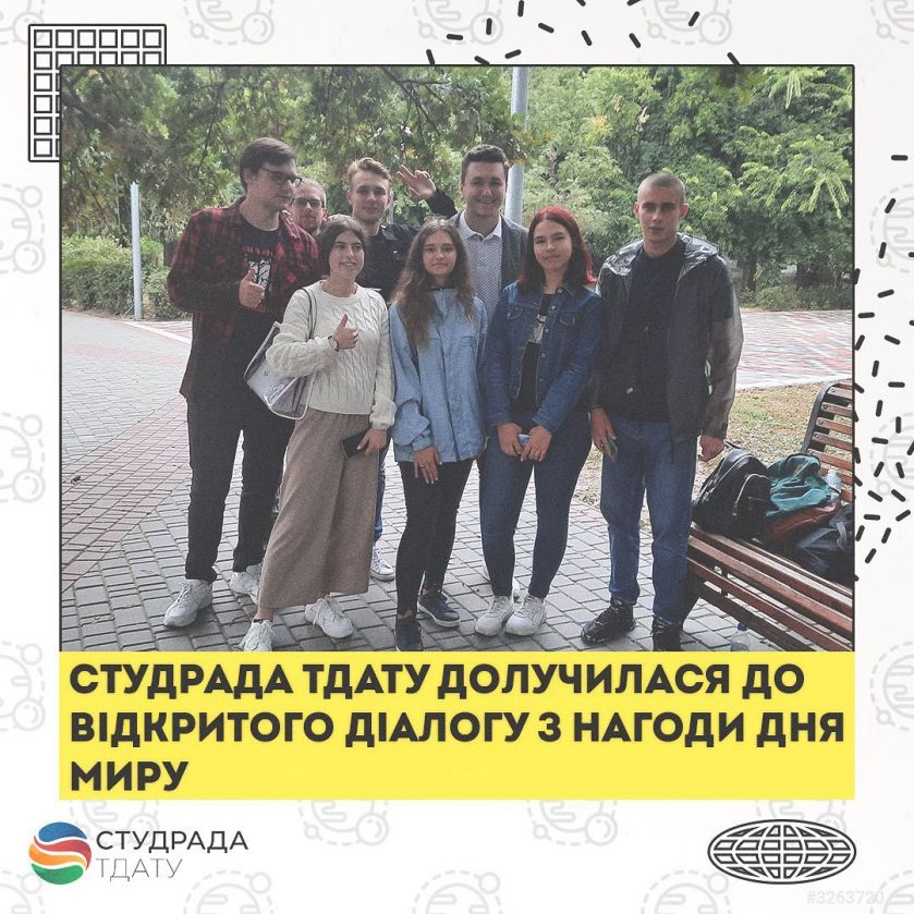 Заходи до Дня Миру в Україні проводяться Молодіжною організацією “СТАН” за підтримки Агентства США з міжнародного розвитку (USAID). Парнерами проєкту в місті Мелітополі стали БО «БФ «МЛТ МУЗЕУМ+» та Мелітопольський міський краєзнавчий музей.