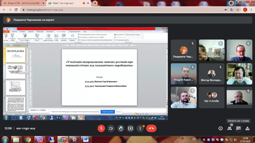 На розгляд науковців було винесено проміжні результати досліджень, пов’язані із поводження з рідкими відходами гальванічного виробництва, на тему: «Утилізація відпрацьованих миючих розчинів при очищенні стічних вод гальванічного виробництва».