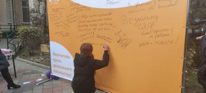 Акція «16 днів проти насильства» охоплює 30 міст України. У Мелітополі на площі біля ВСП «Мелітопольський фаховий коледжу ТДАТУ» організатори встановили помаранчевий банер. Учасники акції написали на ньому свої побажання постраждалим від домашнього насильства та заклики до викорінення цієї проблеми у суспільстві. Також усі бажаючі могли сфотографуватися на фоні банера та опублікувати фото у соціальних мережах, використовуючи хештег #мелітополь_проти_насильства.