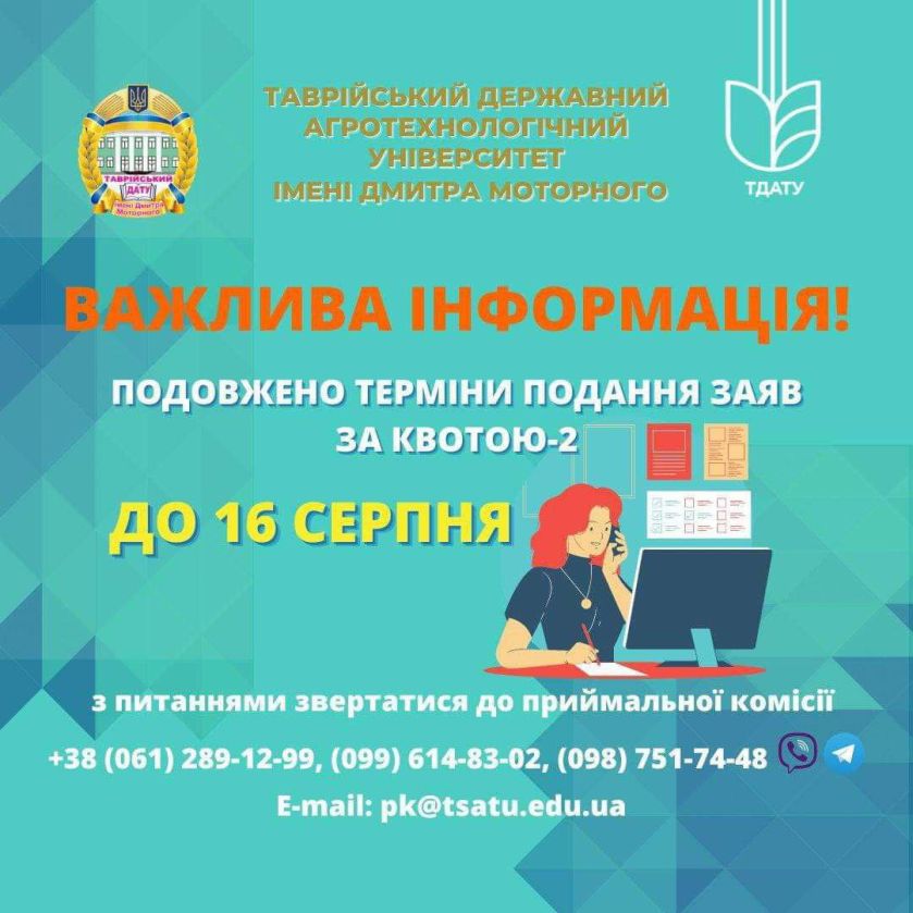 Привіт, вступнику!??♀️У Таврійському державному агротехнологічному університеті імені Дмитра Моторного подовжено термін прийому заяв для ВСТУПУ НА БЮДЖЕТ за квотою- 2 до 16 серпня.?