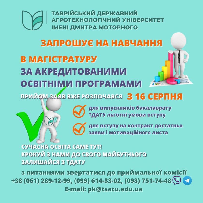 Вступна кампанія у Таврійському державному агротехнологічному університеті імені Дмитра Моторного продовжується ? Відсьогодні розпочинається прийом заяв для вступу на навчання за освітнім ступенем “Магістр”?