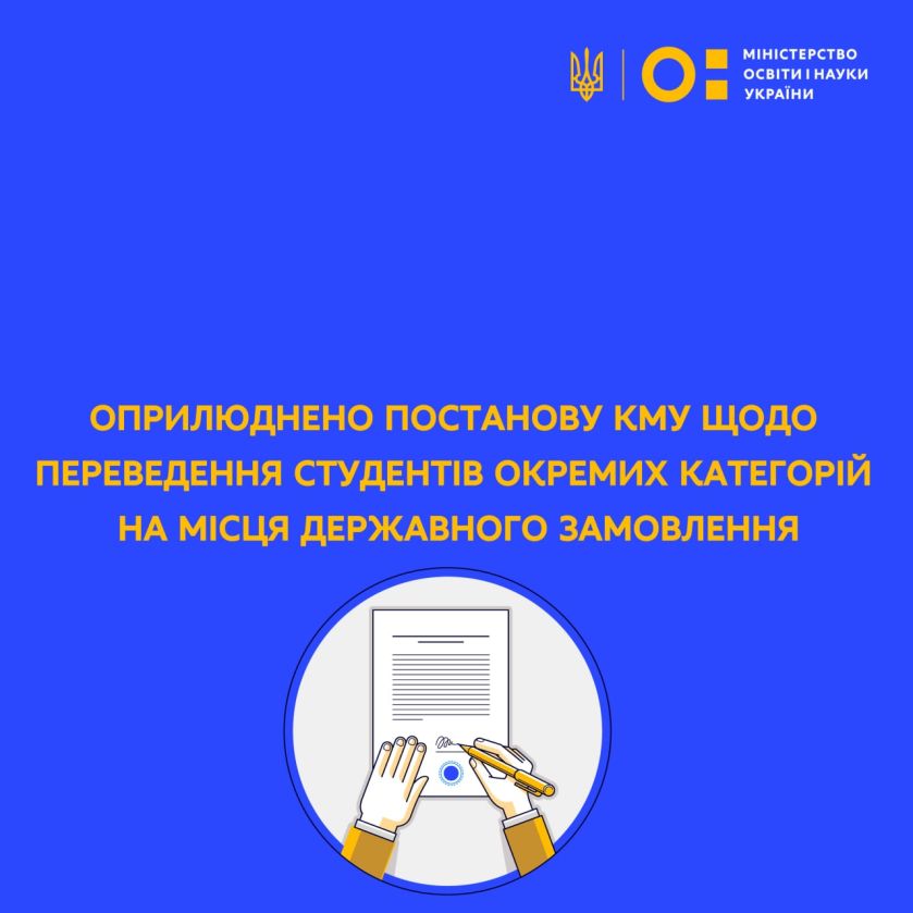 На урядовому порталі оприлюднено постанову КМУ від 28 жовтня 2022 р. № 1224 «Про затвердження Порядку переведення на навчання за державним замовленням окремих категорій здобувачів фахової передвищої, вищої освіти, які зараховані до закладів фахової передвищої, вищої освіти до 2021 року включно на місця, що фінансуються за кошти фізичних та/або юридичних осіб».
