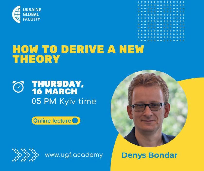 Запрошуємо Вас на онлайн лекцію професора фізики на факультеті фізики та інженерної фізики університету Тулейн (США) Denys Bondar «How to derive a new theory», яка відбудеться в рамках проєкту Ukraine Global Faculty.