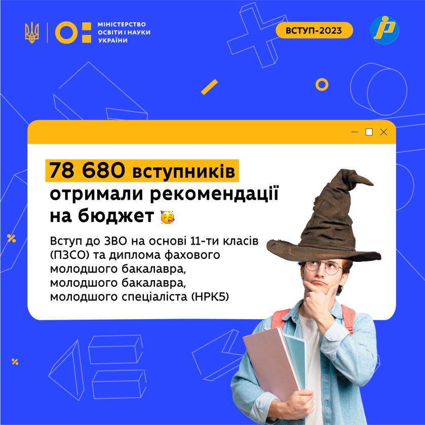 Вступники, що подавали заяви до ЗВО на основі 11-ти класів (ПЗСО) та диплома фахового молодшого бакалавра, молодшого бакалавра, молодшого спеціаліста (НРК5), уже почали отримувати рекомендації до зарахування на бюджет.