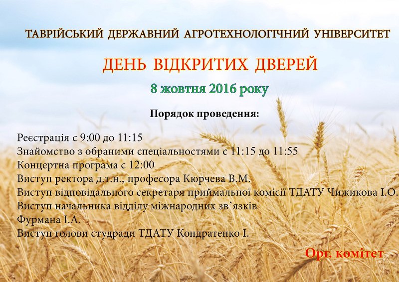 8 жовтня – ДЕНЬ ВІДКРИТИХ ДВЕРЕЙ ТДАТУ! 7.10.2016 8 жовтня 2016 року – День відкритих дверей Таврійського державного агротехнологічного університету. Запрошуємо школярів, студентів коледжів та їх батьків!