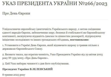 Президент Володимир Зеленський підписав указ № 266/2023, який запроваджує в Україні святкування Дня Європи 9 травня.
