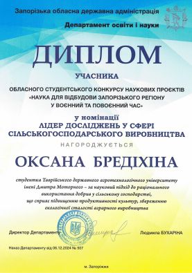 - Поліна ЧЕРНИШОВА, студентка факультету агротехнологій та екології (науковий керівник – к.с.-г.н., доц. Максим ГАНЧУК)