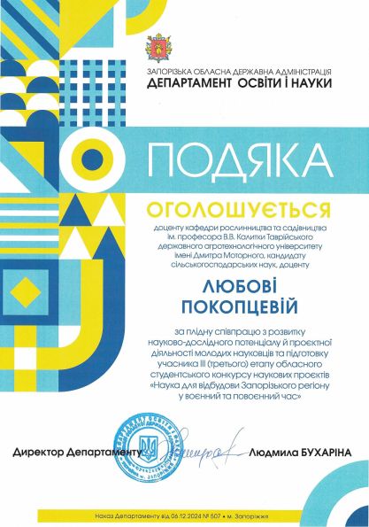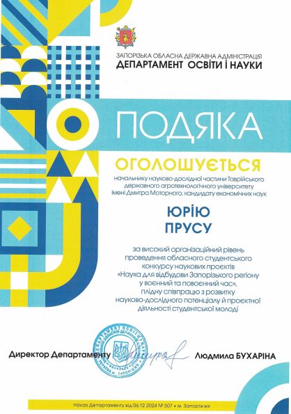 Запорізька обласна державна адміністрація у листопаді – грудні 2024 року зініціювала та провела обласний студентський конкурс наукових проєктів «Наука для відбудови Запорізького регіону у воєнний та повоєнний час». Координацію конкурсу та організаційно-методичне забезпечення здійснював Департамент освіти і науки Запорізької обласної державної адміністрації.