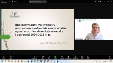 Завідувачка відділу МЯОД Радміла Скляр презентувала результати моніторингу опитування здобувачів вищої освіти щодо якості освітньої діяльності у І семестрі 2024-2025 н.р., відзначивши сильні і слабкі сторони освітнього процесу. Було наголошено, що результати будуть обговорені з гарантами освітніх програм, завідувачами кафедр і здобувачами освіти та оприлюднені на сайті університету.