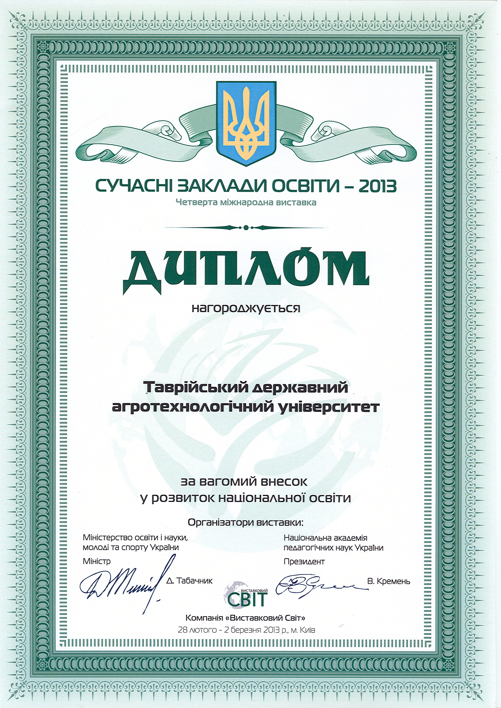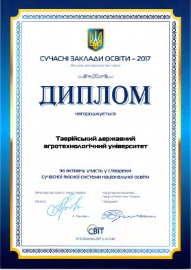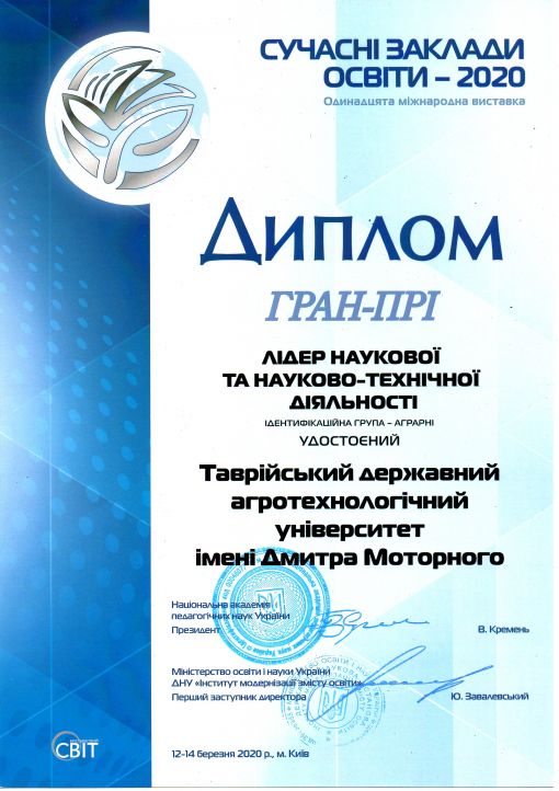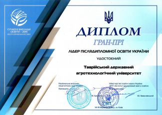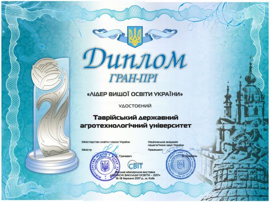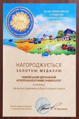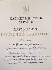 For its significant contribution to the development of agricultural education and science in Ukraine and for training highly qualified specialists for the agricultural sector of the economy, the collective of the Tavria State Agrotechnological University has been awarded: