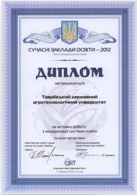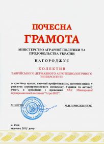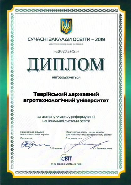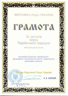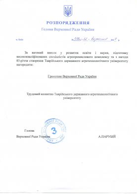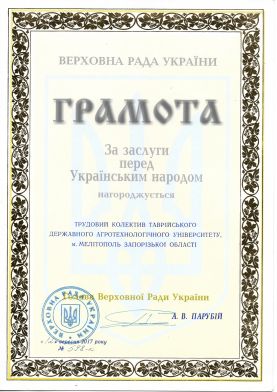 For a significant contribution to the development of domestic science and education, substantial achievements in training highly qualified specialists for the agricultural sector, and the implementation of innovative technologies in the educational process, the collective of the Tavria State Agrotechnological University was awarded the Certificate of Honor of the Verkhovna Rada of Ukraine “For Services to the Ukrainian People.”