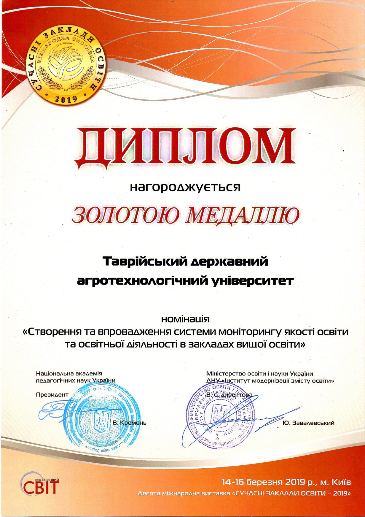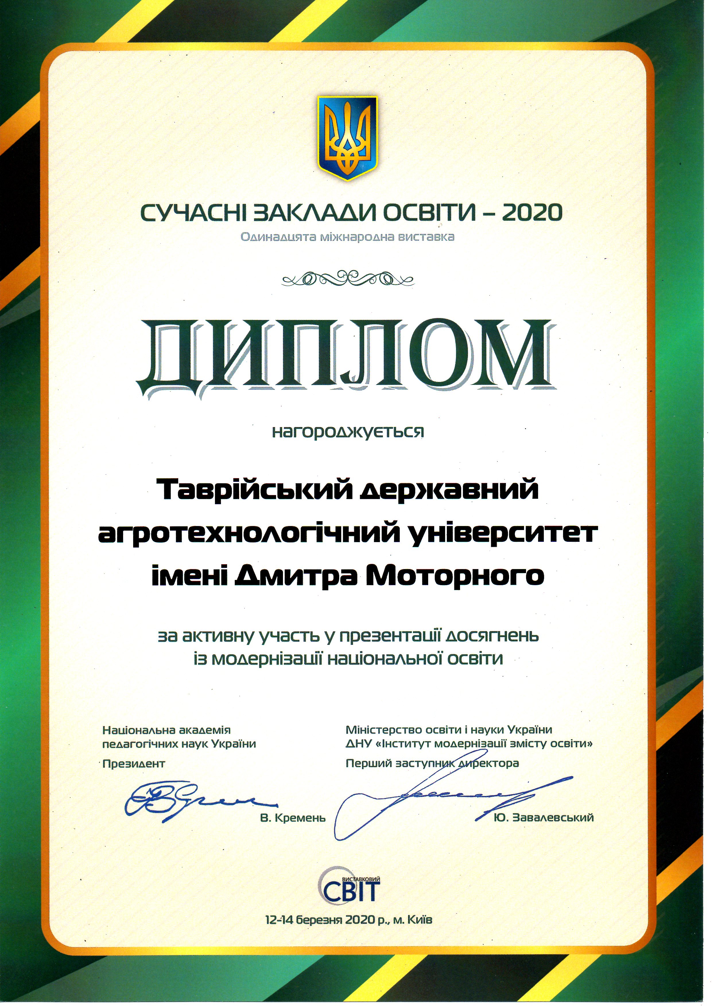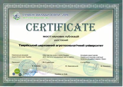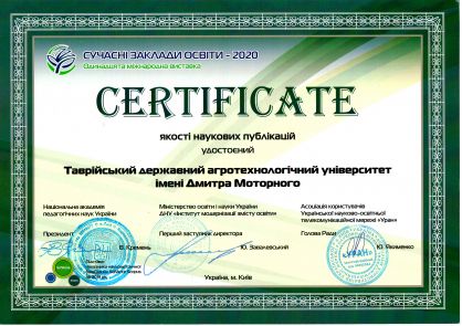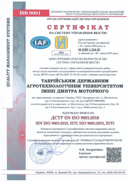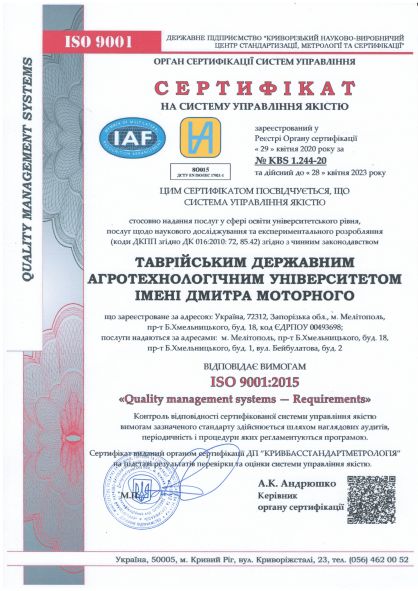In April 2020, the Dmytro Motornyi Tavria State Agrotechnological University successfully completed the certification procedure for its higher education quality assurance system in compliance with the new international quality standard ISO 9001:2015 “Quality management systems – Requirements” and the National Quality Standard DSTU ISO 9001:2018.
