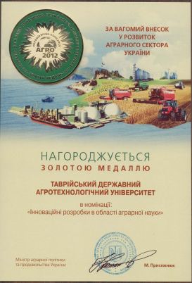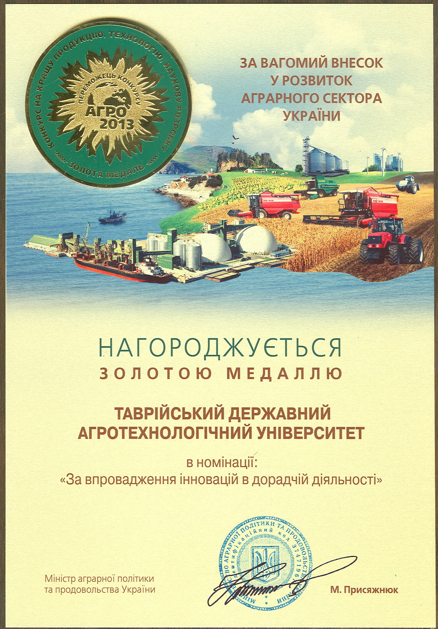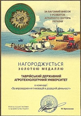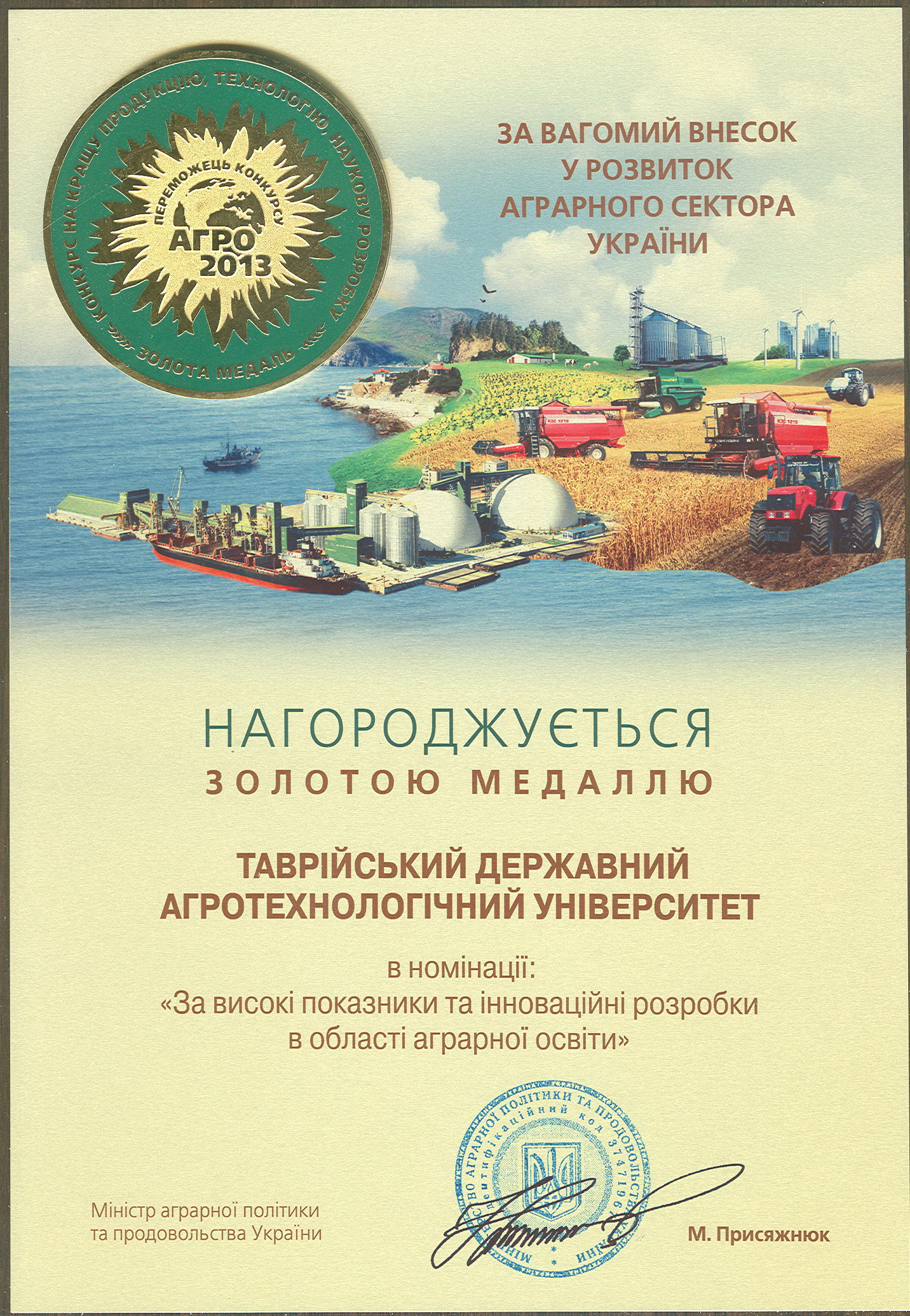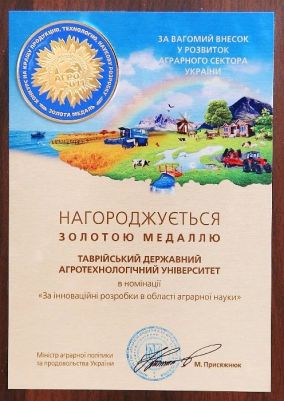 At the International Agro Exhibitions-Fairs*, the Ministry of Agrarian Policy and Food of Ukraine awarded TSATU with: