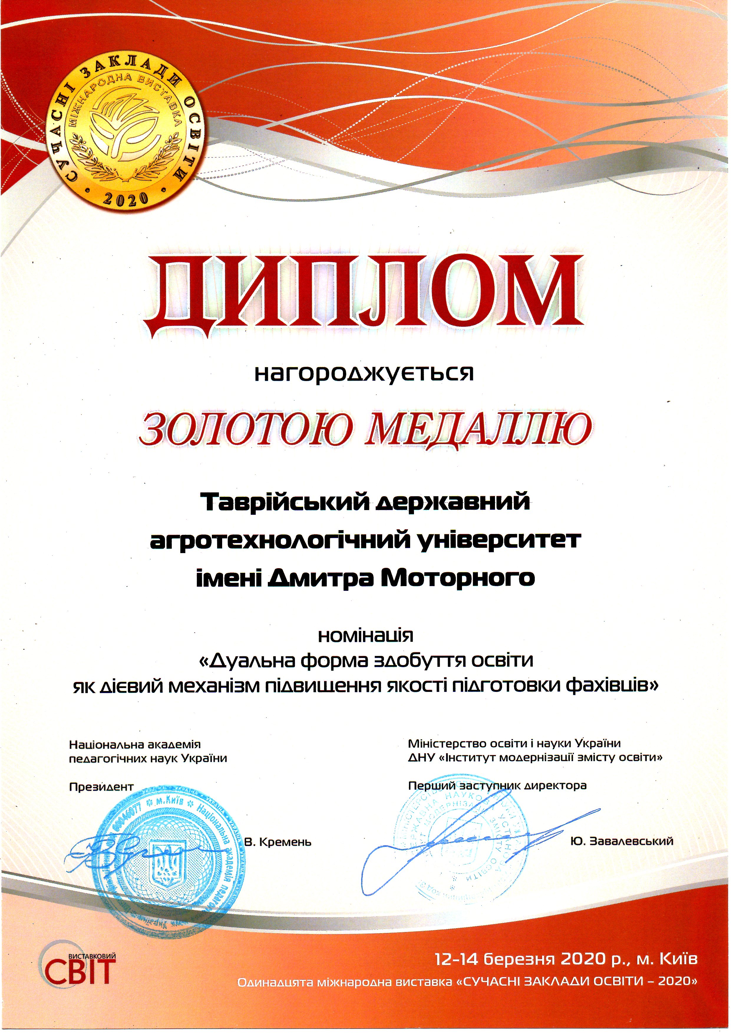 At the International Exhibition “Modern Educational Institutions – 2024,” despite the occupation of Melitopol and the temporary relocation of TSATU to Zaporizhzhia, the Dmytro Motornyi Tavria State Agrotechnological University was recognized with: