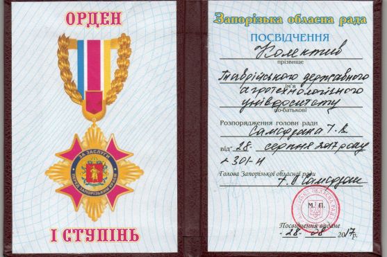This recognition was conferred by the decree of the Head of the Regional Council dated August 28, 2017, No. 301-n “On awarding the Order ‘For Merit to the Zaporizhzhia Region.”