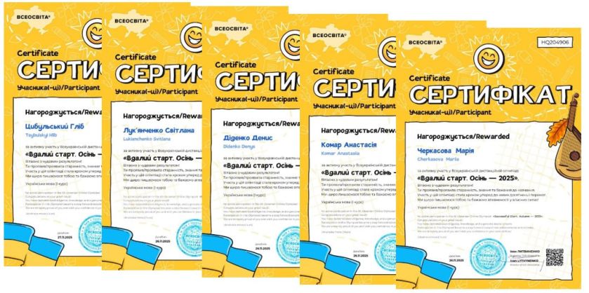 Особливо хочеться відзначити студентів, які продемонстрували високу мотивацію та бажання вдосконалюватися: Світлану Лук’янченко, Дениса Діденка, Гліба Цибульського, Анастасію Комар та Марію Черкасову. Під керівництвом викладача української мови Елли Гєнчєвої вони взяли участь в онлайн-олімпіаді з української мови, продемонструвавши відповідальність, наполегливість та щире прагнення до знань.