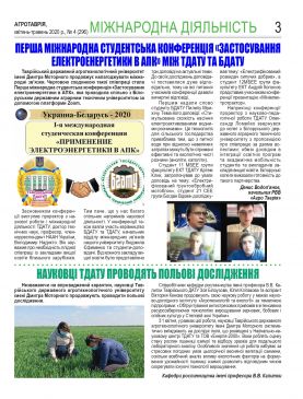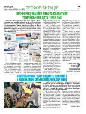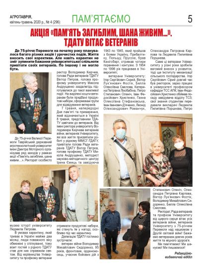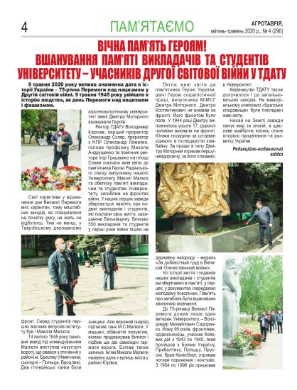 Переглянувши номер, можна дізнатися: про те як у Таврійському державному університеті імені Дмитра Моторного пам’ять викладачів та студентів- учасників Другої світової війни шанували, як у ТДАТУ новітня магістерська програма «Агрокебети» буде реалізовуватися та як в умовах карантину науковці нашого університету польові дослідження проводили. А також, читайте у номері: про першу Міжнародну студентську конференцію «Застосування електроенергетики в АПК» між ТДАТУ та БДАТУ, сучасну пасіку у Таврійському ДАТУ та що треба знати абітурієнтам аби стати студентом нашого закладу вищої освіти.