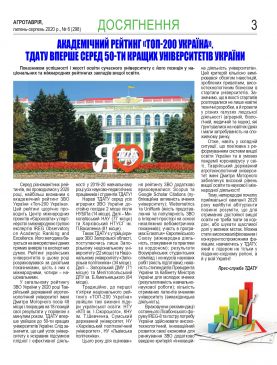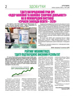 Переглянувши номер, можна дізнатися: які нагороди отримав Таврійський державний агротехнологічний університеті імені Дмитра Моторного на ХІ Міжнародній виставці «Сучасні заклади освіти – 2020», про те, яке місце посів Таврійський ДАТУ у академічному рейтингу ТОП-200 та хто зі студентів нашого університету іменні стипендії отримав.