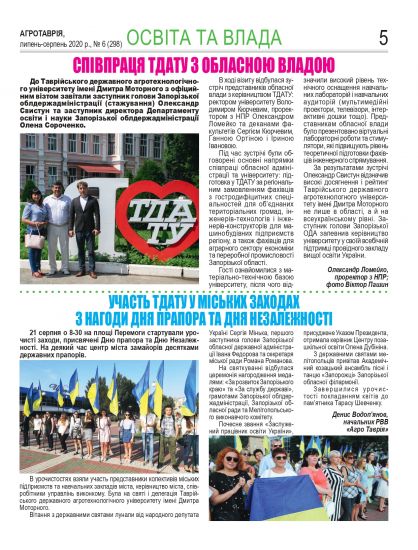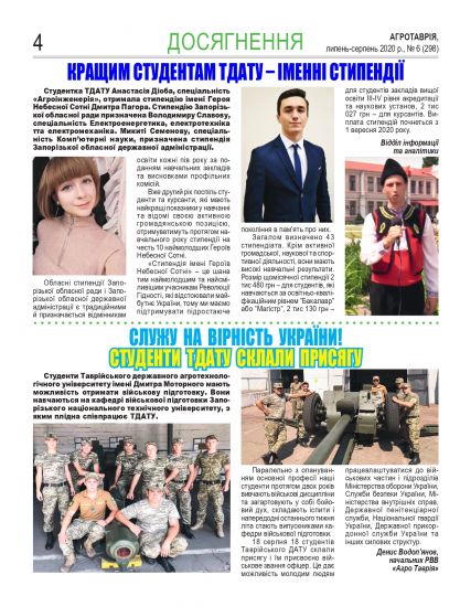 Переглянувши номер, можна дізнатися: які нагороди отримав Таврійський державний агротехнологічний університеті імені Дмитра Моторного на ХІ Міжнародній виставці «Сучасні заклади освіти – 2020», про те, яке місце посів Таврійський ДАТУ у академічному рейтингу ТОП-200 та хто зі студентів нашого університету іменні стипендії отримав.