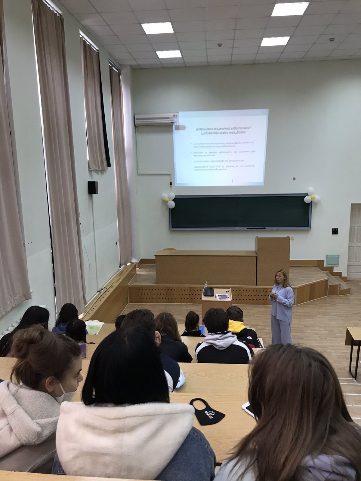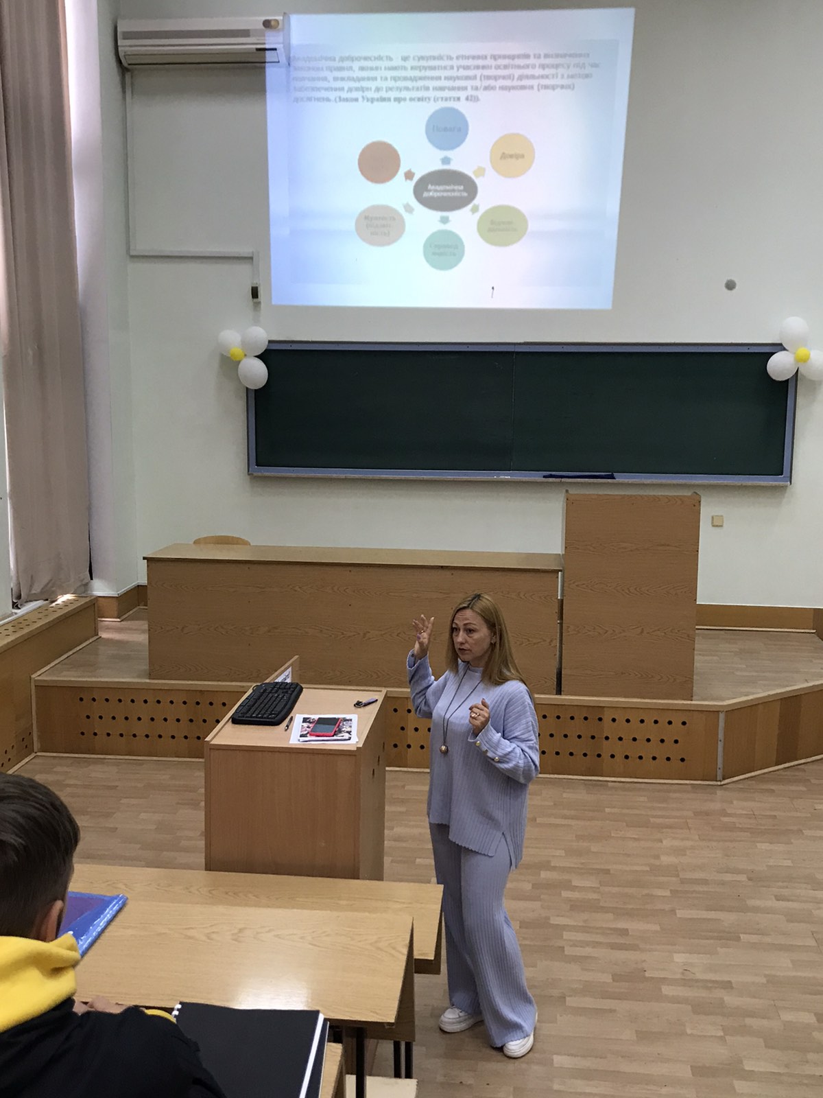 6 жовтня 2021 року на кураторській годині факультету АТЕ відбулось обговорення питань академічної доброчесності зі студентами спеціальності «Готельно-ресторанна справа». Заступник декана з організаційно-виховної роботи Людмила Шлєіна ознайомила академічну спільнотуз поняттям академічної доброчесності як проблеми суспільства. Людмила Іванівна наголосила на тому, що академічна доброчесність – відповідальність кожного за дотримання принципів:
