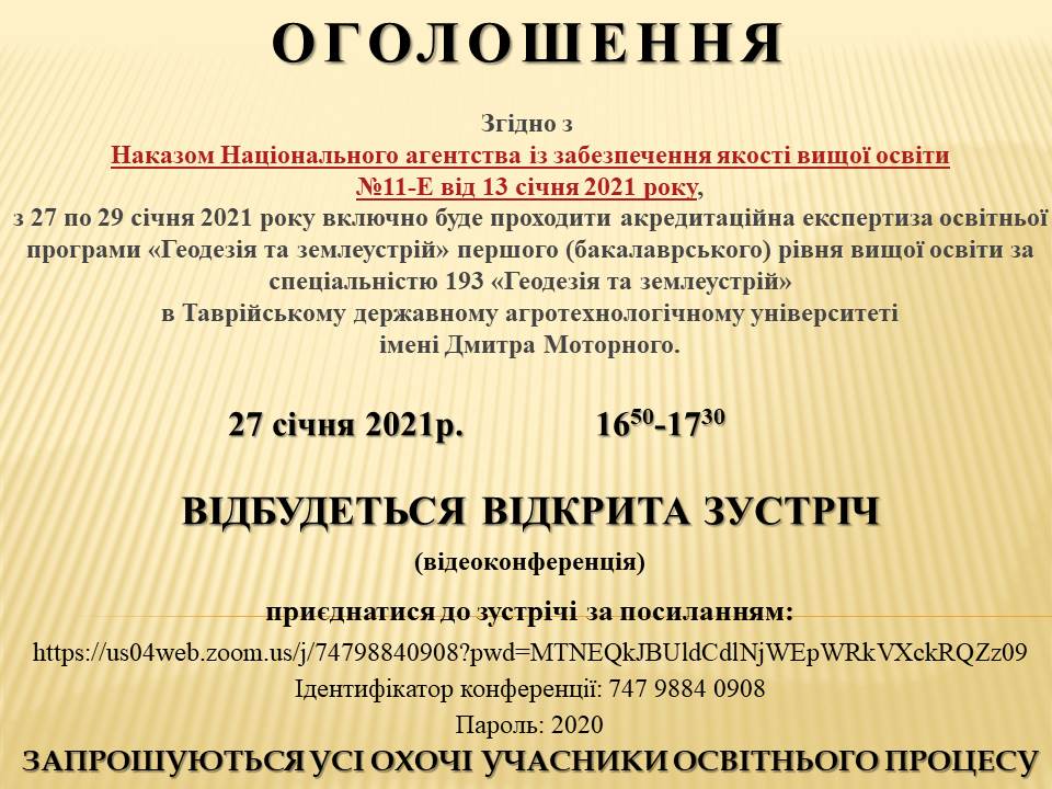 З 27 – 29 січня 2021 року буде проходити акредитаційна експертиза освітньої програми «Геодезія та землеустрій» першого (бакалаврського) рівня вищої освіти за спеціальністю 193 «Геодезія та землеустрій» 27.01.2021