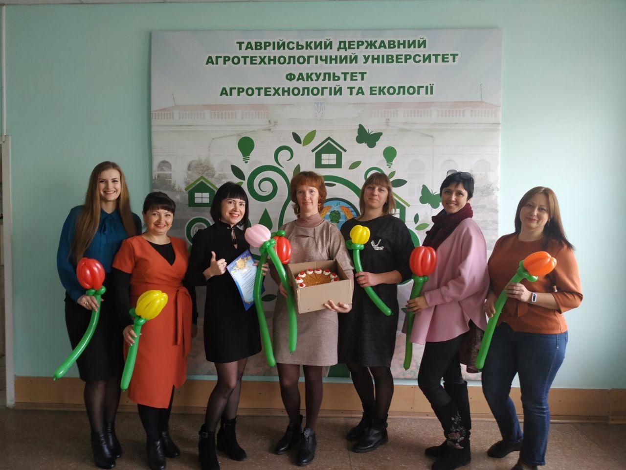 Шостого березня, напередодні Міжнародного жіночого дня, декан факультету агротехнологій та екології ТДАТУ Іванова І.Є. привітала жінок кафедр факультету зі святом весни, краси і любові. У цей святковий день побажала Миру і любові, величезного щастя і радості, здоров’я, світлих безхмарних днів, успіхів, творчих звершень та здобутків, як в особистих справах, так і в роботі, щоб свято наповнило будиноки квітами, сонцем і веселощами, подарувало турботу і тепло рідних, увагу, посмішки колег і друзів, а також завжди залишатися такими ж чарівними і красивими і нехай завжди щастить, а всі плани і заповітні мрії збуваються!