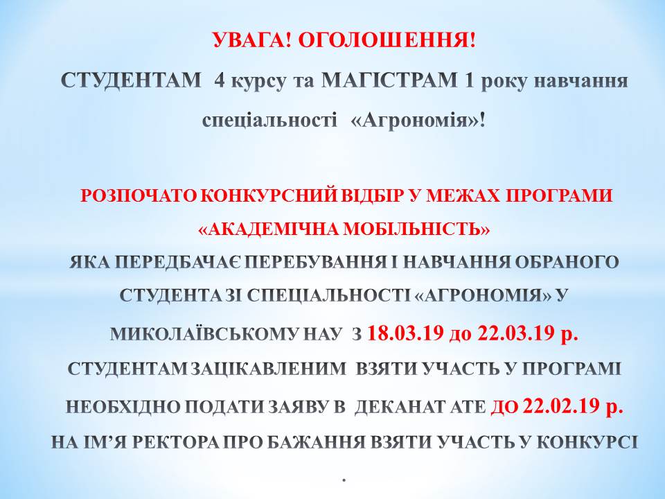 УВАГА! ОГОЛОШЕННЯ!СТУДЕНТАМ 4 курсу та МАГІСТРАМ 1 року навчання спеціальності «Агрономія»! 20.02.2019