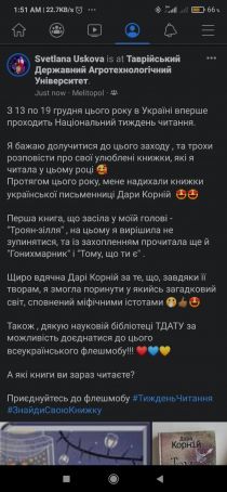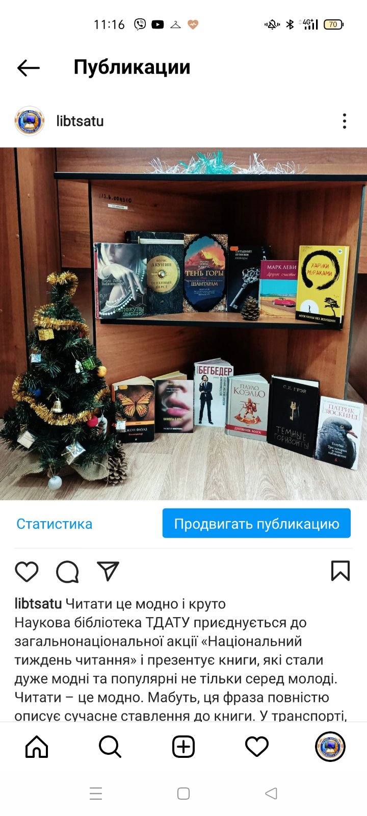 Наукова бібліотека разом із студентами ТДАТУ приєдналася до загальнонаціональної акції «Національний тиждень читання», яка проходить з 13-го до 19-те грудня у межах українського культурного простору.