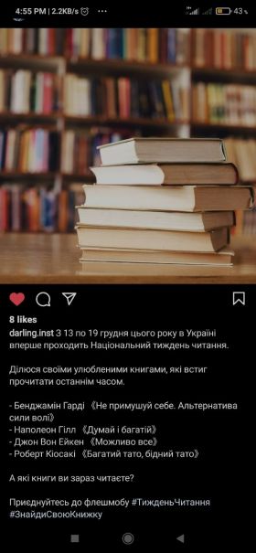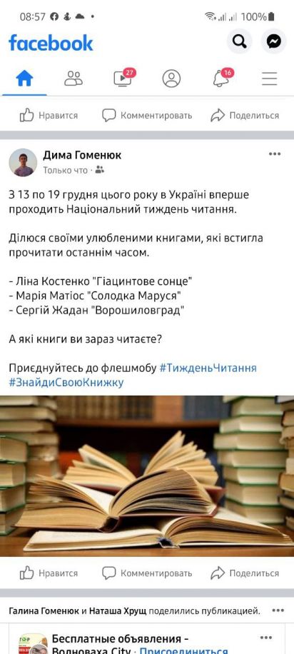 А для цього ми зробили цікаві пости на тематику читання у різних соціальних мережах: Facebook, Instagram, на сторінці веб-сайту наукової бібліотеки, на блозі БІБЛІО LIFE. Найцікавіші з них пропонуємо до вашої уваги та закликаємо приєднатися всіх бажаючих до акції. Для цього вам потрібно розмістити цікавий пост, світлину чи відео, які якимось чином пов’язані з читанням у вашому житті та показують, що читання не тільки пробуджує у вас різноманітні емоції, але і є вашою життєвою стратегією.
