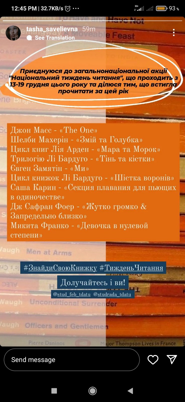 Наукова бібліотека разом із студентами ТДАТУ приєдналася до загальнонаціональної акції «Національний тиждень читання», яка проходить з 13-го до 19-те грудня у межах українського культурного простору.